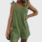 The Emma Playsuit is the perfect choice for sunny days and relaxed hours. Its sleeveless design with bow detail at the shoulders adds a playful touch, while the loose fit offers complete freedom of movement. Pair it with sandals or trainers, and you’re instantly ready for a holiday, a city outing, or a garden party.