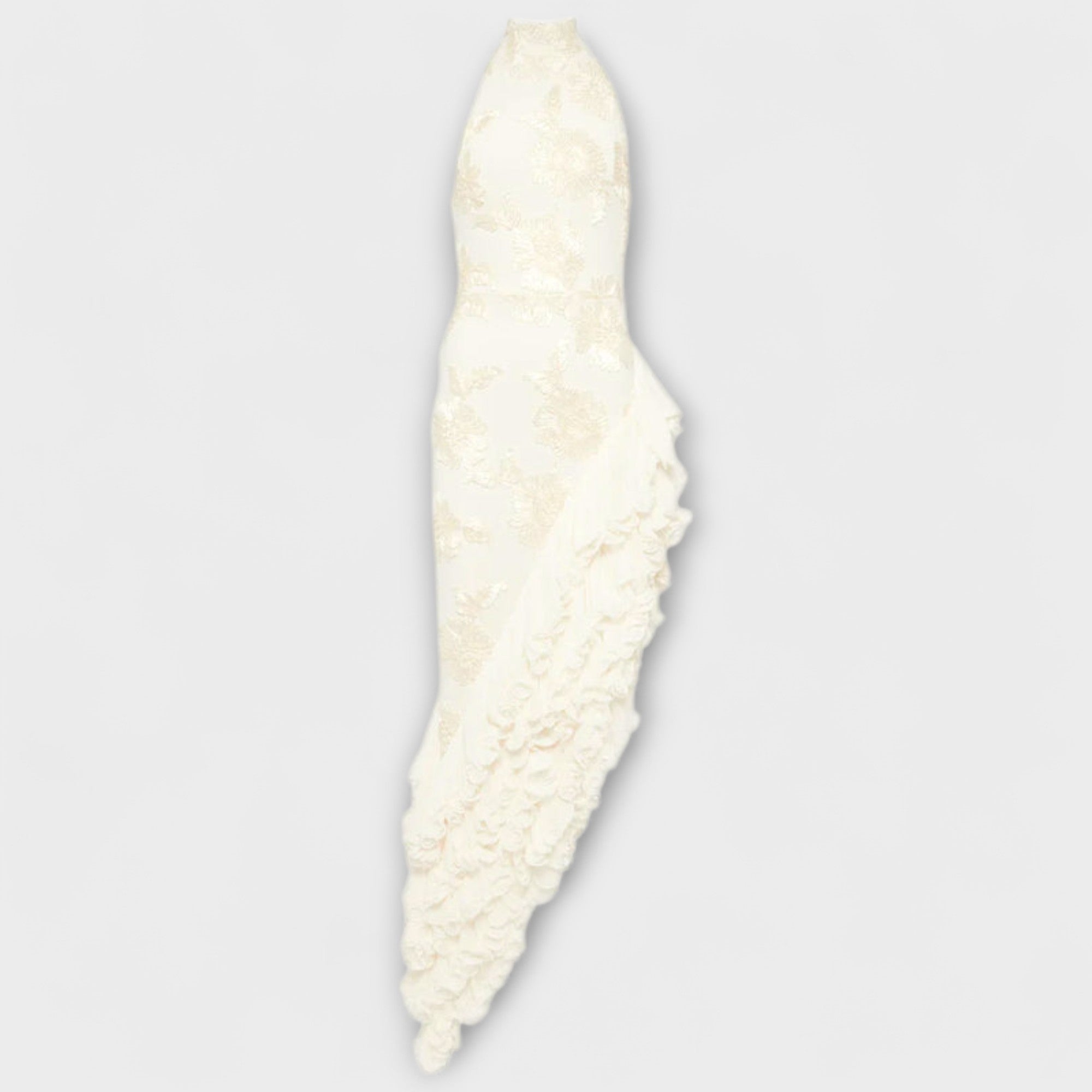 Experience ethereal elegance with our maxi dress featuring floral appliqués, a breathtaking blend of romance and grace. This enchanting piece boasts delicate 3D floral appliqués that unfold over a fluid, floor-length silhouette.
