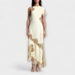 Discover the perfect combination of elegance and comfort with our diagonally cut, asymmetrical dress. It is designed to elegantly flatter your body and features exquisite lace trim inserts as well as a chic keyhole back with hook-and-eye closure.