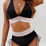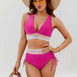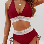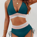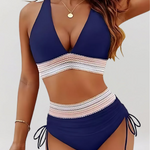 Show off your style with this high-waisted blue bikini featuring a retro weave at the waist. It offers a unique combination of femininity, support, and comfort – perfect for the beach or pool.