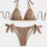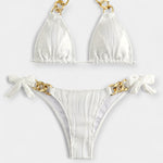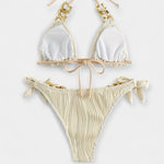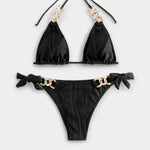 Modern and alluring, this two-piece bikini impresses with its textured striped fabric and gold details in ring and chain. The halter neckline and triangle top accentuate the bust, while the bow on the side adds a playful character – perfect for a stylish pool or beach day.