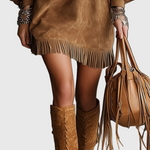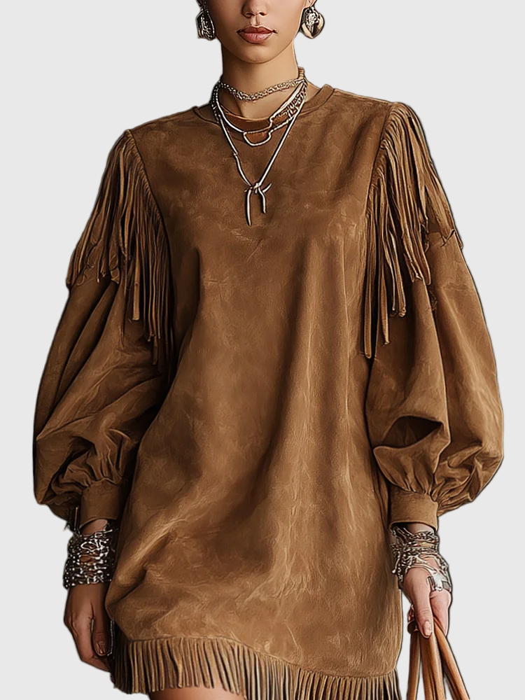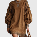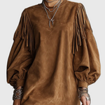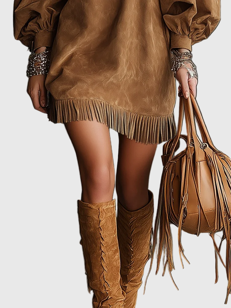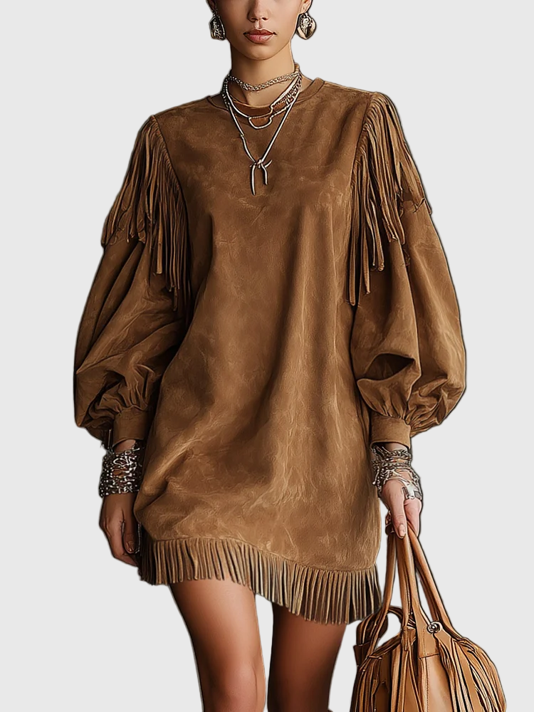 The suede mini dress Emma brings a playful western element to refined contemporary style. Made from soft faux suede with vintage inspiration, it combines feminine confidence with effortless movement. Romantic puffed sleeves and delicate fringes add an artistic touch, while the relaxed silhouette highlights gracefulness. A wonderful choice for autumn outings, weekend getaways, or evening events — daring, stylish, and beautifully unique.
