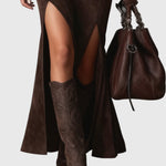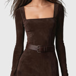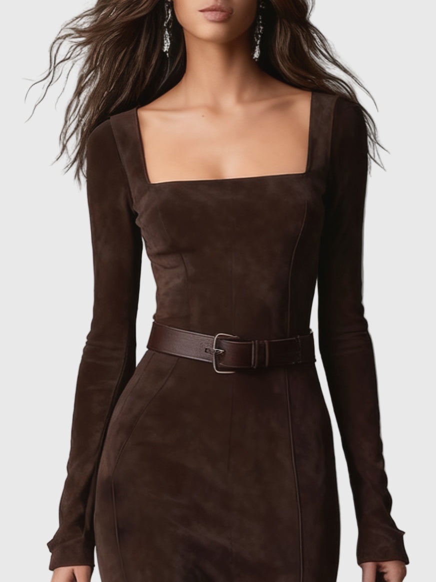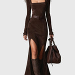 The dress Ainsley | Maxi Dress in Faux Leather combines exquisite elegance with bold sophistication. Made from smooth, luxurious faux leather in a deep espresso tone, it features an impressive square neckline and a silhouette that accentuates the figure. A sophisticated thigh-high slit adds grace and a touch of allure — a powerful, yet feminine piece for evenings when you want to feel confident, elegant, and unforgettable.