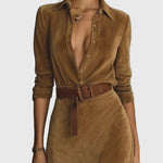Experience the luxurious comfort and sophisticated style of the Célianne dress. Made from soft suede, this fitted maxi dress elegantly hugs your figure, while the classic cut-out collar adds a touch of elegance, making it ideal for both business meetings and elegant evenings out.