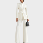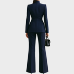 1. Flattering Fit – The blazer's sharp tailoring and the trousers' flared cut work together to create a sleek, elongated profile that enhances your natural shape.