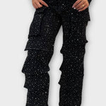 Turn heads with these Sparkle Ruffle Cargo Pants – where streetwear edge meets party-ready glamour.